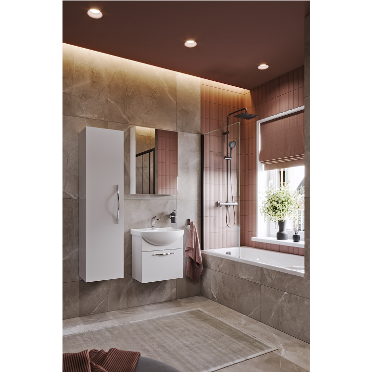 Линейка мебели представлена как напольными, так и подвесными тумбами в пяти размерах: 50, 65, 75, 85 и 105 см по ширине.