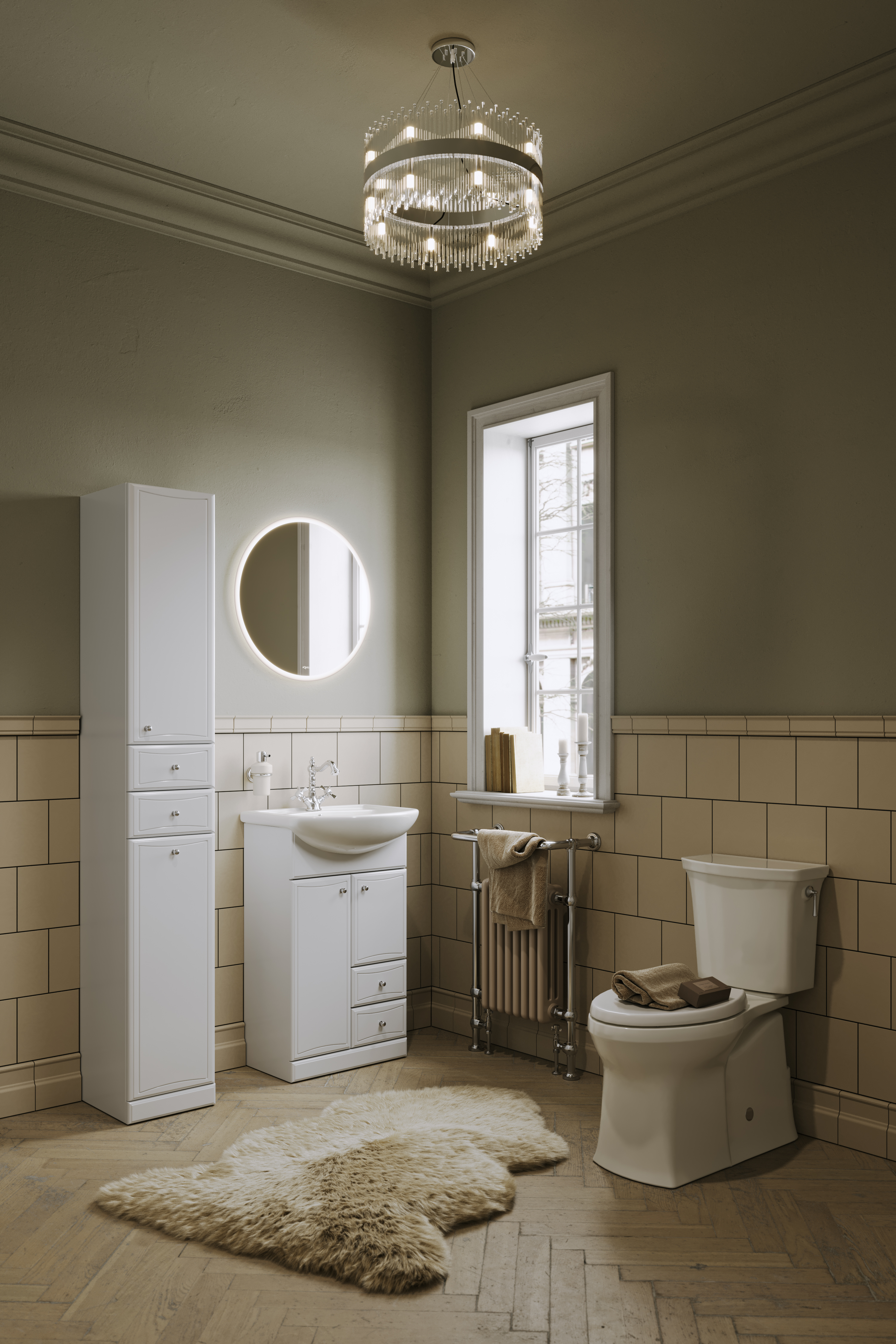 Коллекция в классическом стиле представлена напольными тумбами в пяти размерах: 55, 65, 75, 85 и 105 см по ширине.