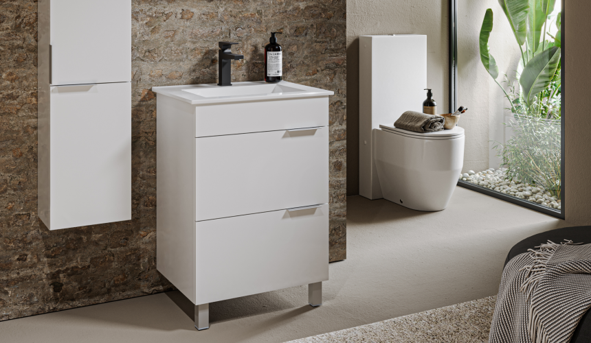 Мебель доступна белом цвете, покрыта глянцевой эмалью. Коллекция представлена как напольными, так и подвесными тумбами в двух размерах: 60 и 75 см по ширине.
