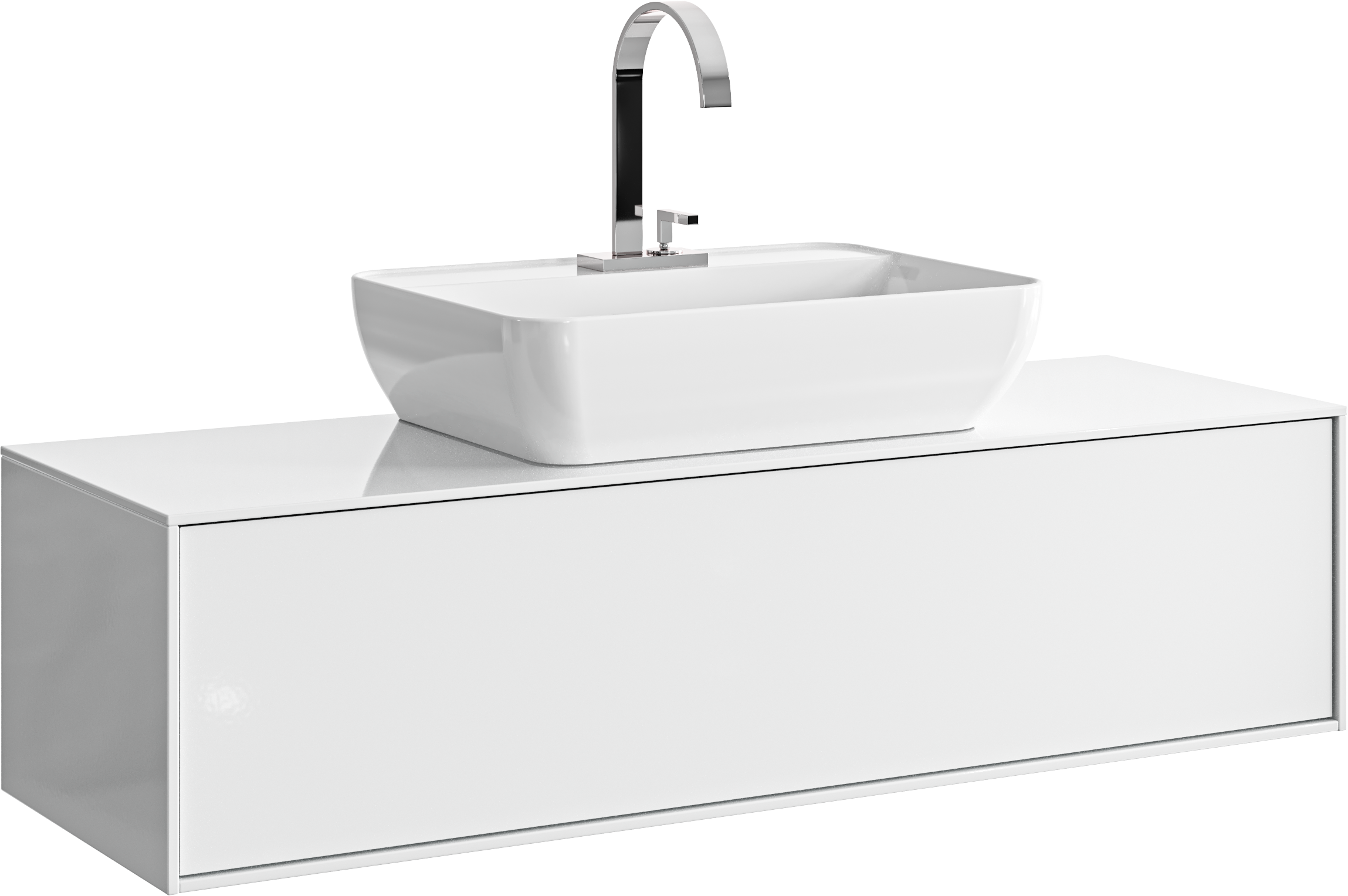 Подвесная тумба с одним ящиком в цвете белый глянец с умывальником из литьевого мрамора.