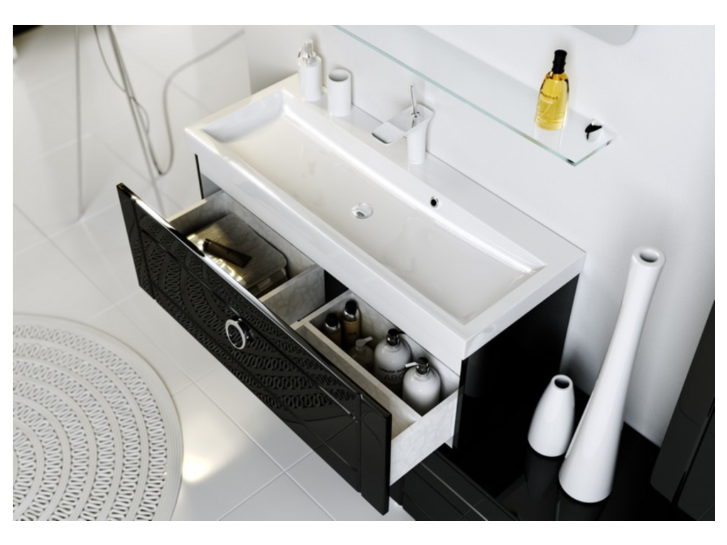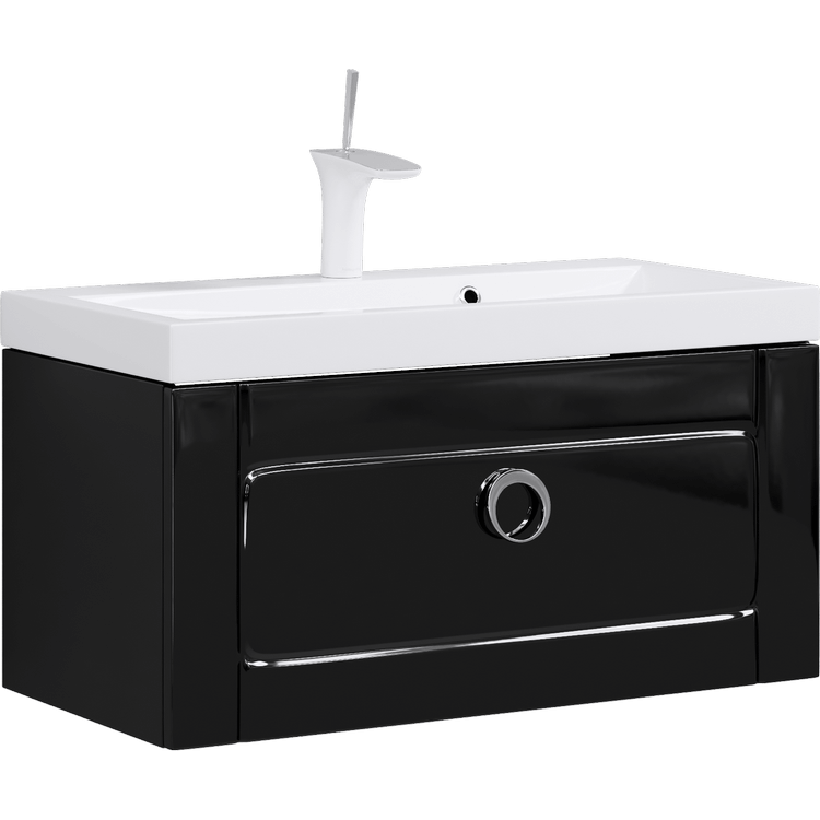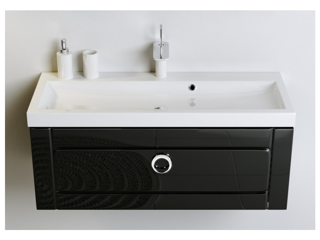 Подвесная тумба с одним ящиком в черном глянцевом с умывальником из литьевого мрамора.