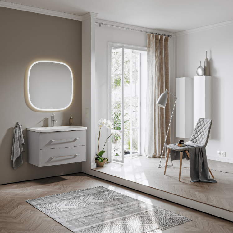 Коллекция Neringa – это сольное выступление подвесной тумбы Neringa шириной 80 см с изогнутым фасадом.
