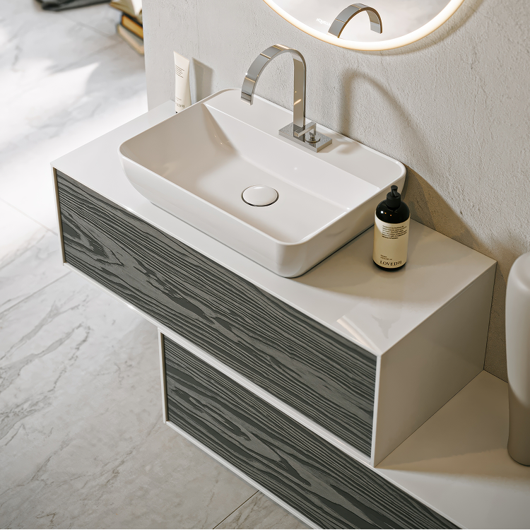 Дизайнеры все чаще обращаются к природным фактурам в предметах интерьеров ванных комнат. Мебель Genesis может комплектоваться фасадами из ЛДСП с глубокой фактурой дерева от итальянского производителя Cleaf – цвет миллениум серый (MG), а также в белом глянце (W) – фасады из МДФ (древесноволокнистой плиты повышенной плотности) покрыты эмалью в 5 слоев. Корпус из МДФ покрыт 5 слоями белой глянцевой эмали, а также усилен алюминиевыми профилями, исключающими возможность изменения геометрии мебели. Столешница, на которую устанавливается умывальник из литьевого мрамора, дополнительно покрыта защитным лаком, устойчивым к механическим воздействиям. Тумба оборудована ящиком полного выдвижения. Боковины ящиков металлические, толщиной всего 12 мм. Внутри ящиков находятся антискользящие коврики. Зеркала коллекции – влагостойкие, со светодиодной подсветкой, сенсорным выключателем и системой обогрева, противодействующей его запотеванию.