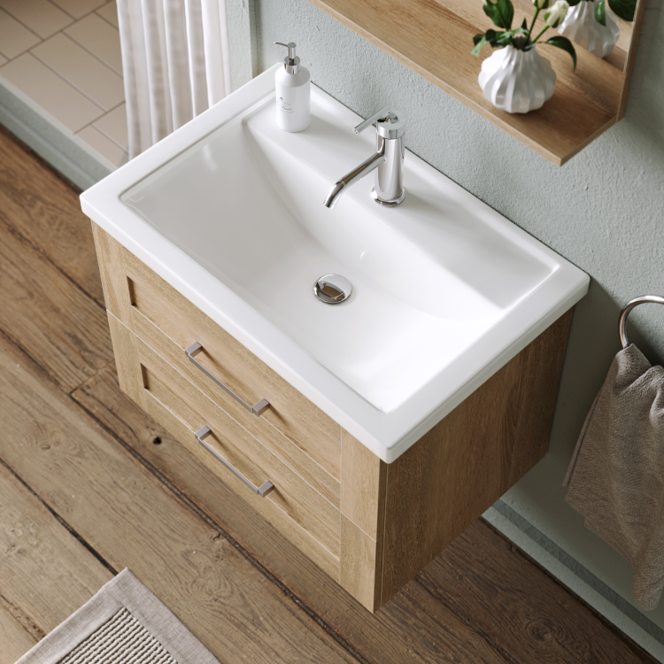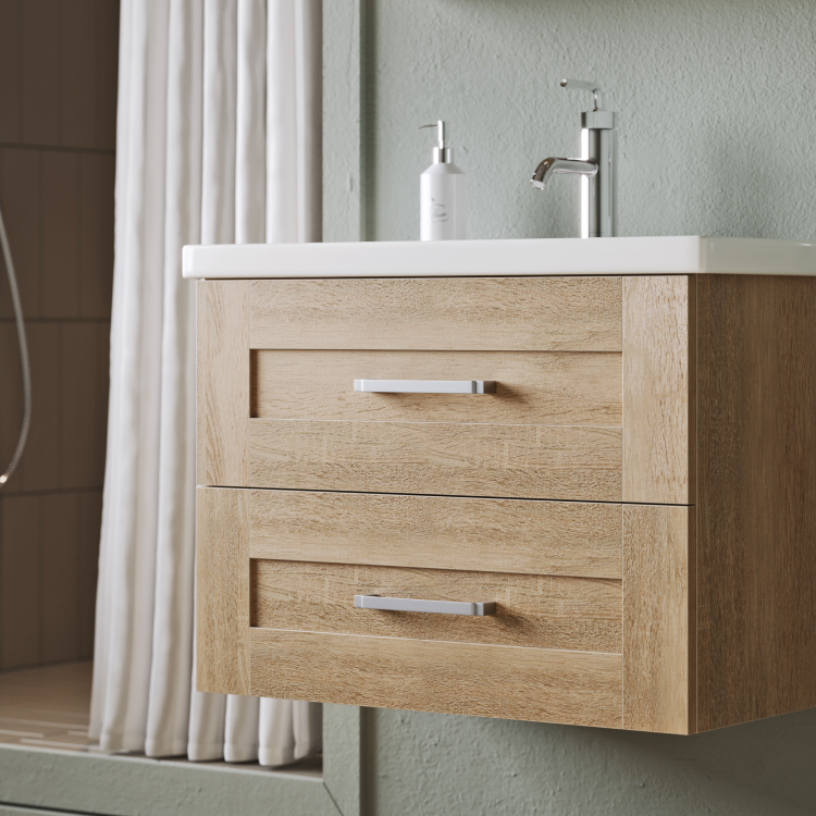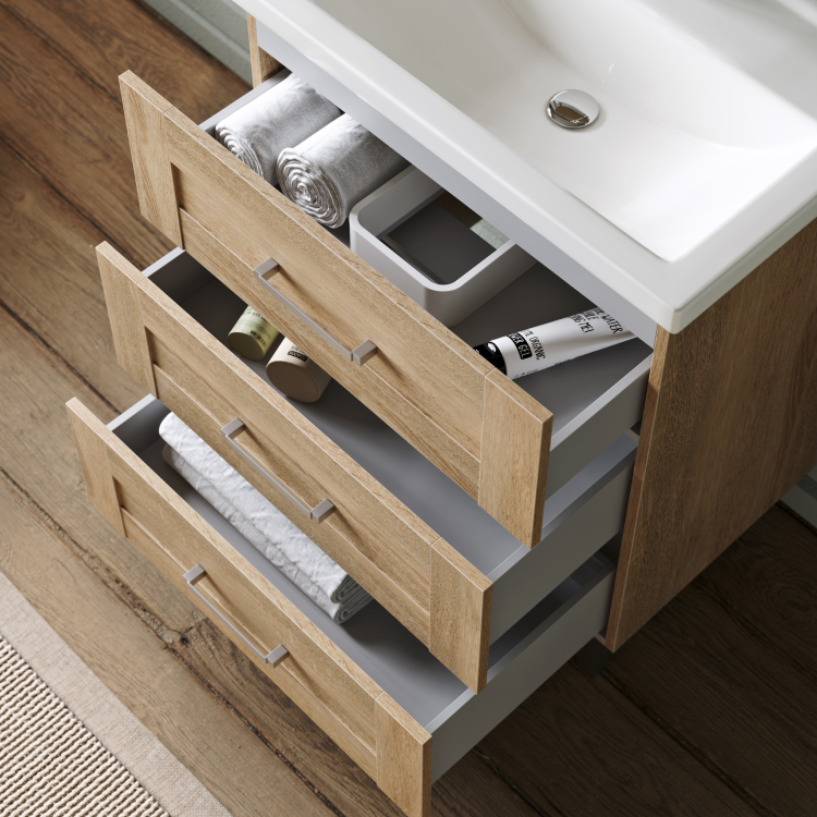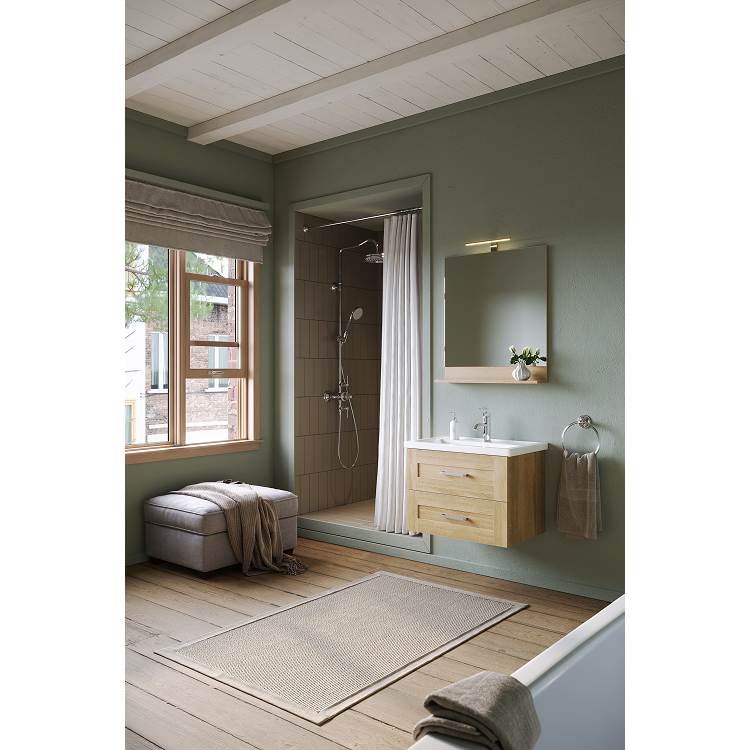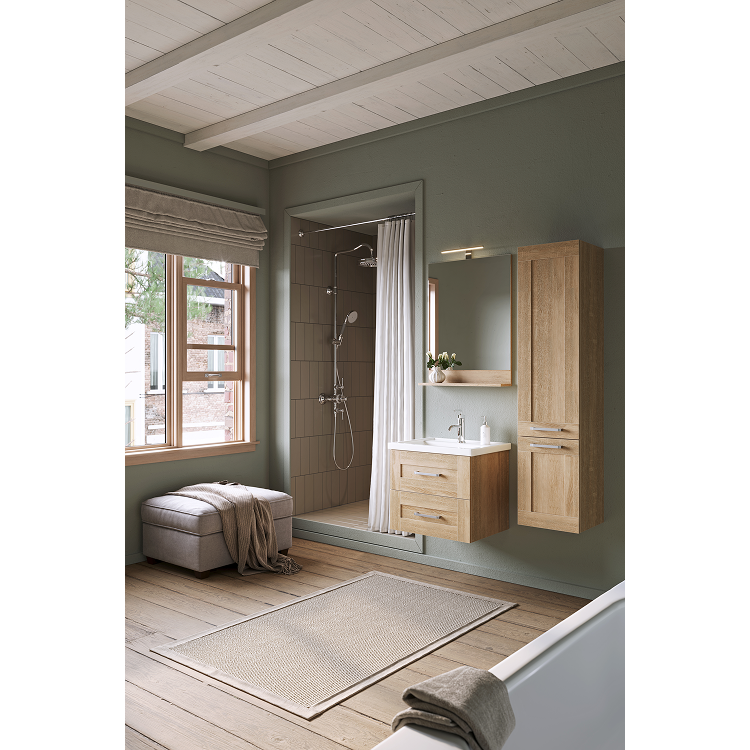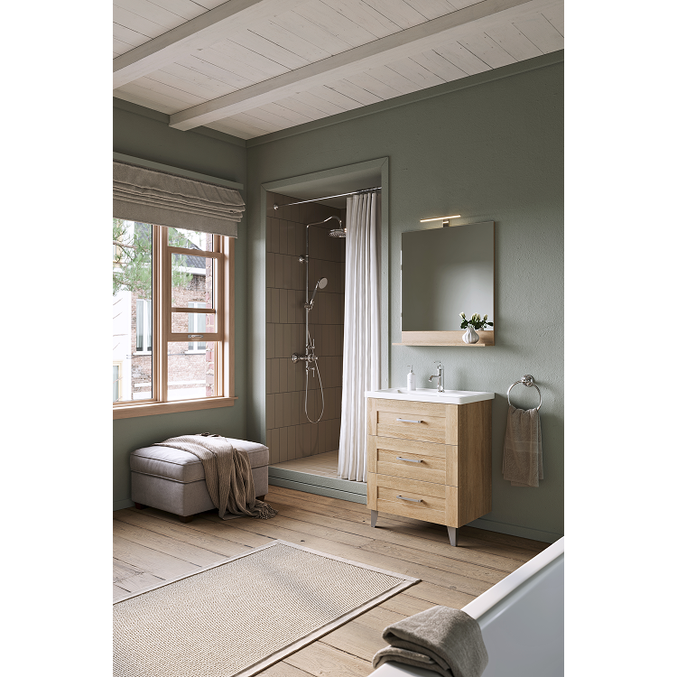 Мебель доступна в цвете дуб сонома. Коллекция представлена как напольными, так и подвесными тумбами в трех размерах: 60, 70 и 80 см по ширине, с различным функционалом. Гарнитуры комплектуются керамическими умывальниками коллекции Фостер производства российского завода Kirovit. Ящики тумб оснащены скрытыми направляющими с системой мягкого закрывания. Внутри ящика ЛДСП в цвет корпуса мебели. Зеркало с полочкой оборудовано светодиодным светильником и выключателем. Фасады и корпус выполнены из ЛДСП (древесностружечной плиты повышенной плотности).