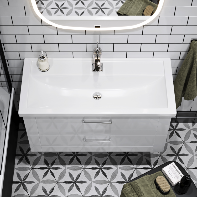 Тумбы Manchester поставляются в двух вариантах: напольные с тремя ящиками и подвесные с двумя ящиками. Гарнитуры представлены в размерах 60, 70, 80 и 100 см. Фасады мебели производятся из МДФ (древесноволокнистой плиты повышенной плотности) и покрыты 5-ю слоями белой глянцевой эмали. Боковины из ЛДСП (древесностружечной плиты повышенной плотности) также окрашены. На металлической хромированной ручке выполнена гравировка с логотипом AQWELLA. Ящики тумб оснащены скрытыми направляющими с системой мягкого закрывания. Дно ящиков – ЛДСП серого цвета. Особенностью данной коллекции является система организации внутреннего пространства: в верхнем ящике установлен пластиковый лоточек с тремя отсеками для хранения. Гарнитуры комплектуются керамическими умывальниками серии Фостер производства российского завода Kirovit. Коллекция Manchester также может комплектоваться зеркальными шкафами серии МС, которые являются универсальными и могут применяться ко многим гарнитурам мебели ТМ «AQWELLA». В качестве дополнительного элемента предлагается подвесной универсальный (левый/правый) пенал шириной 35 см с двумя дверьми.