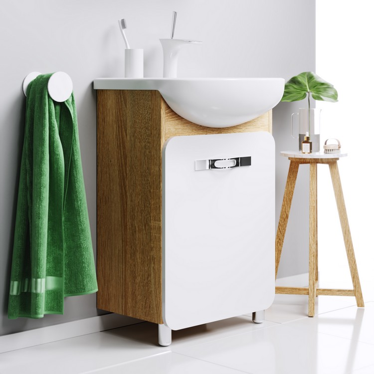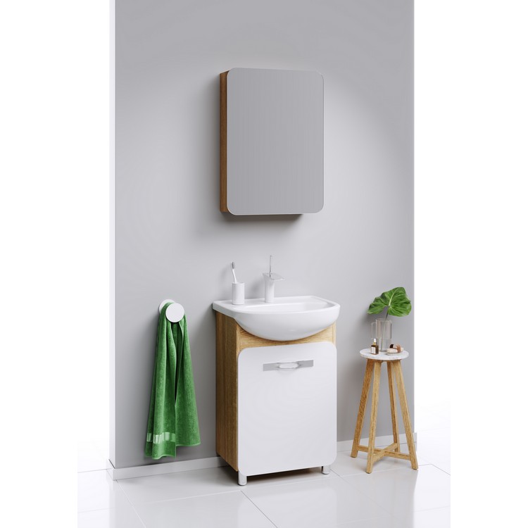 Мебель для компактных ванных комнат представлена напольной тумбой в размере 55 см, которая комплектуется керамическим умывальником российского завода Kirovit. Тумба комплектуется зеркальным шкафом с левым открыванием. На все двери установлены мебельные петли с интегрированным доводчиком, обеспечивающим плавное закрывание. Фасады коллекции производятся из МДФ (древесноволокнистой плиты повышенной плотности) и покрыты 5-ю слоями белой матовой эмали. Боковины из ЛДСП (древесностружечной плиты повышенной плотности) в цвете дуб сонома.