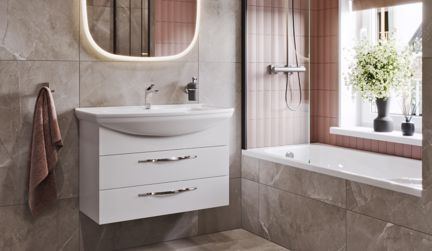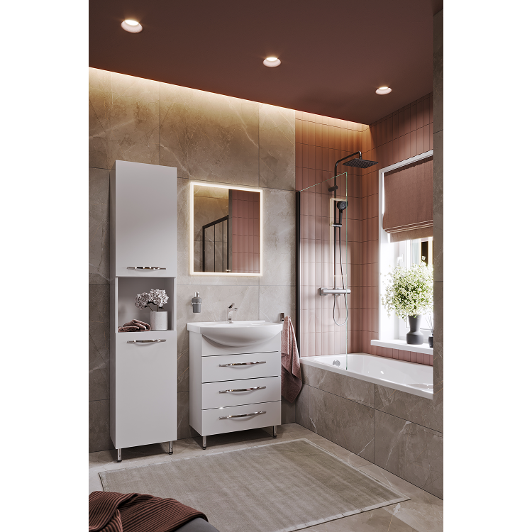 Линейка мебели представлена как напольными, так и подвесными тумбами в пяти размерах: 50, 65, 75, 85 и 105 см по ширине.