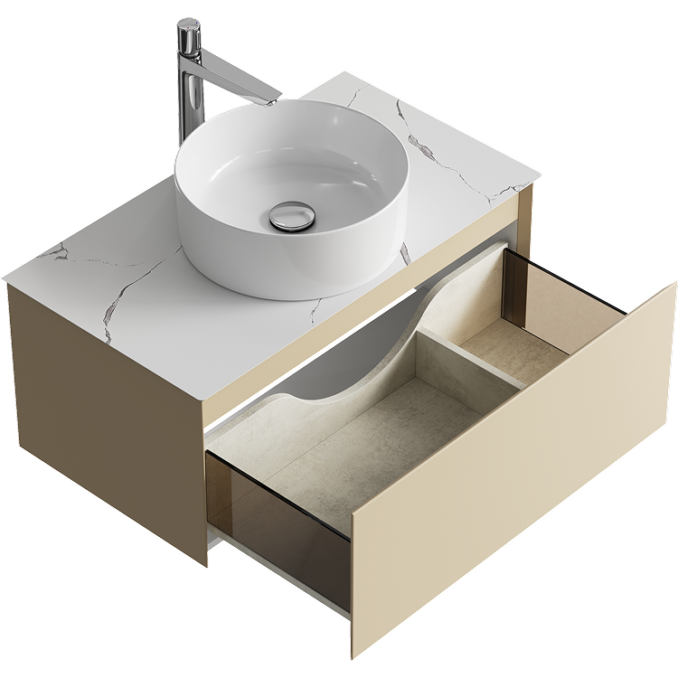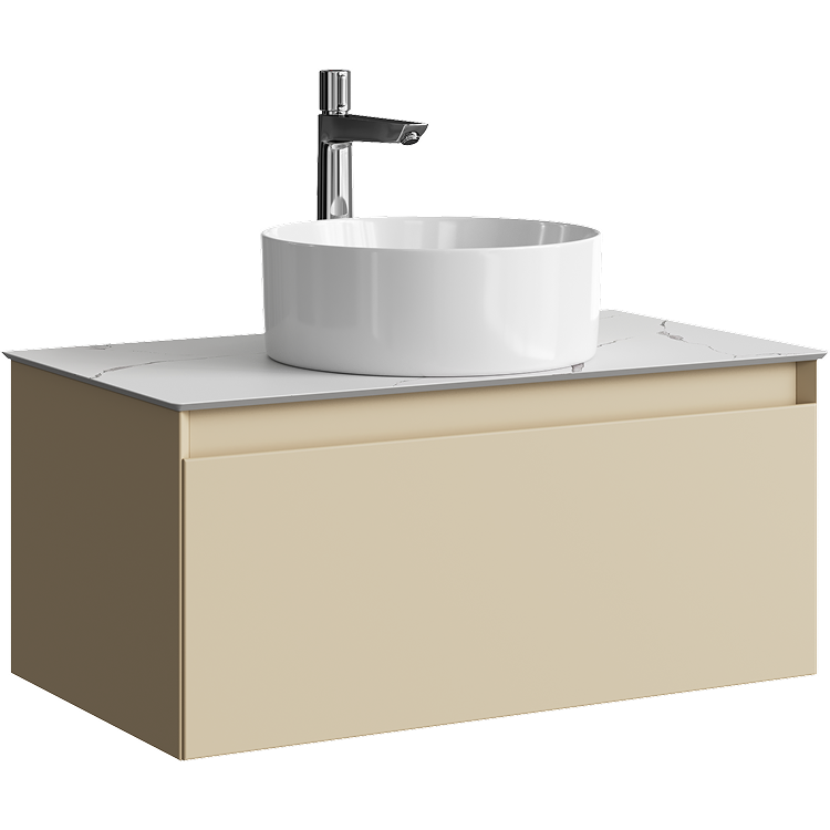 Подвесная тумба с одним ящиком 81 см, цвет морская дюна со столешницей мрамор белый и накладным умывальником