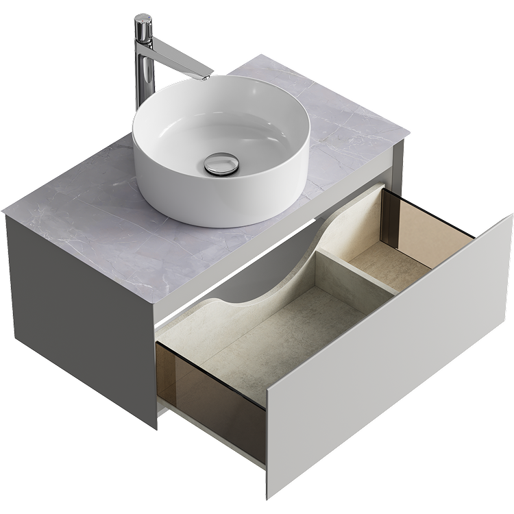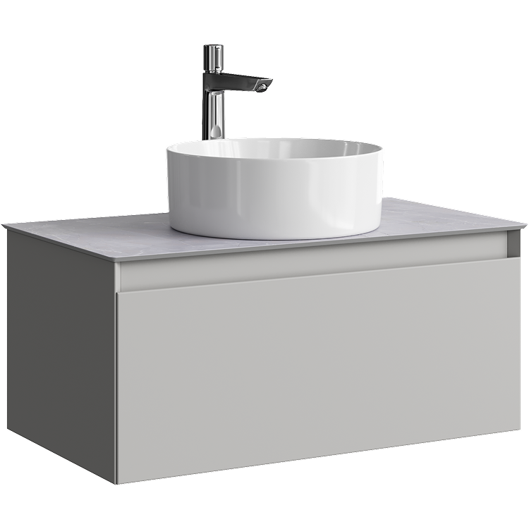 Подвесная тумба с одним ящиком 81 см, цвет серый туман со столешницей серый камень и накладным умывальником