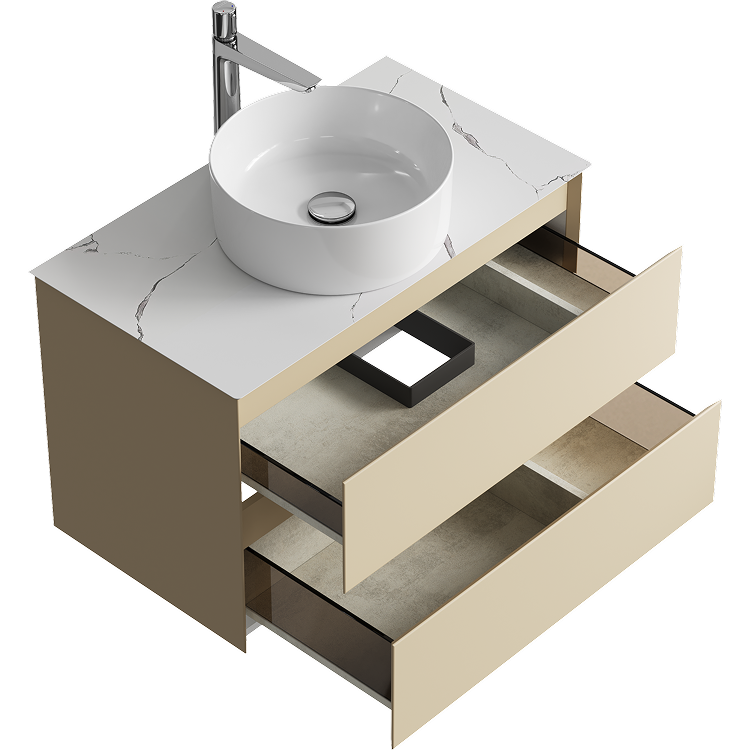 Подвесная тумба с двумя ящиками 81 см, цвет морская дюна со столешницей мрамор белый и накладным умывальником