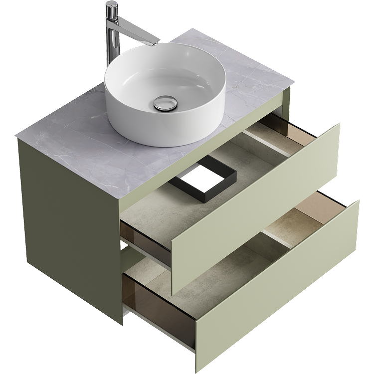 Подвесная тумба с двумя ящиками 81 см, цвет зеленый шалфей со столешницей серый камень и накладным умывальником
