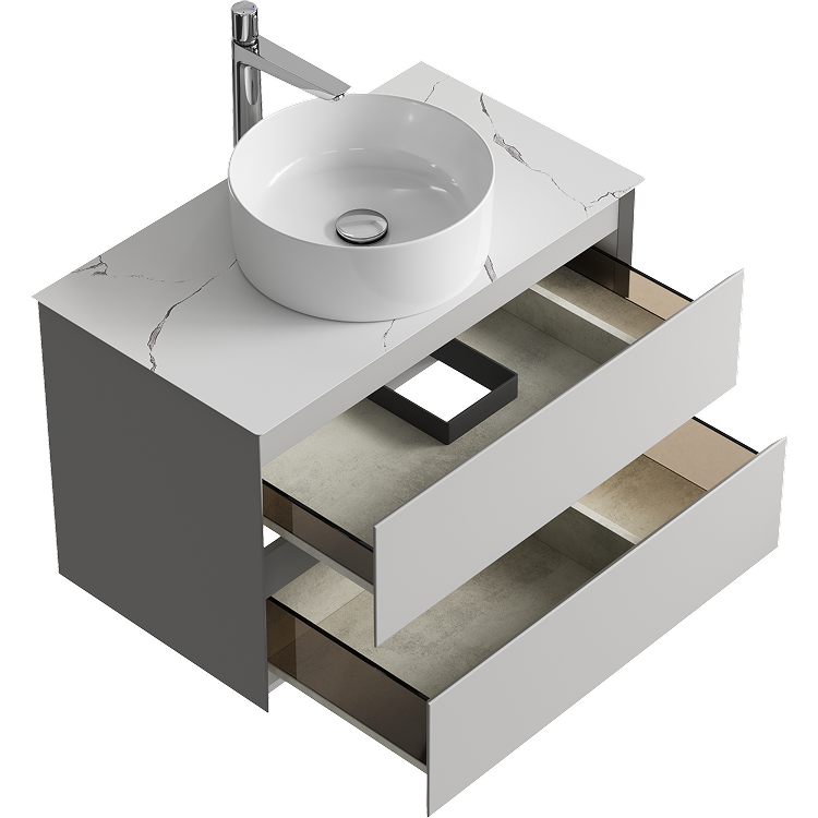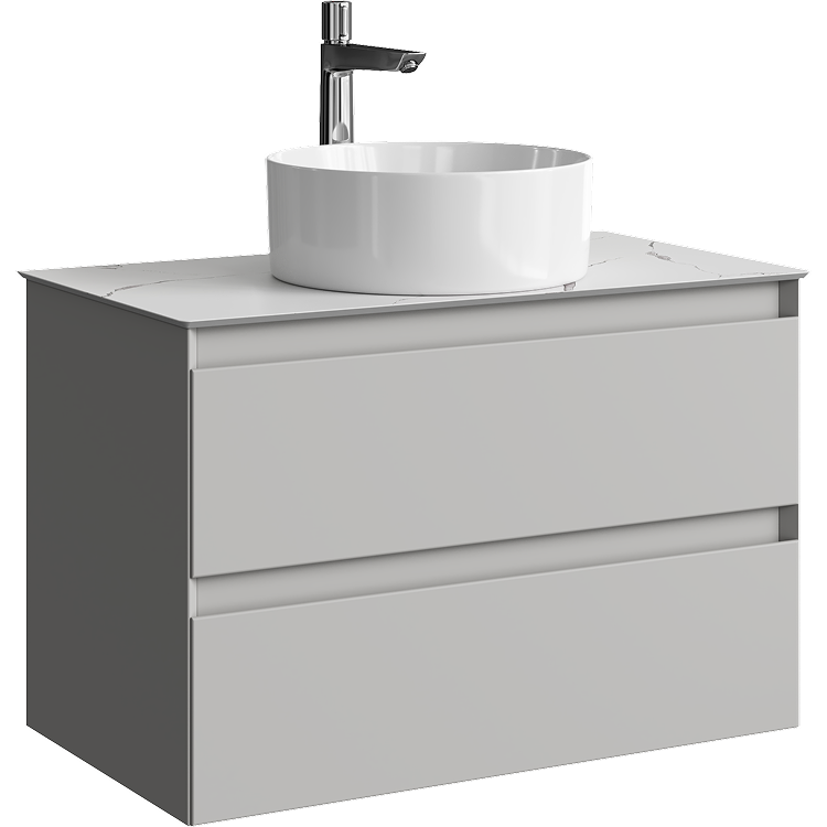 Подвесная тумба с двумя ящиками 81 см, цвет серый туман со столешницей мрамор белый и накладным умывальником