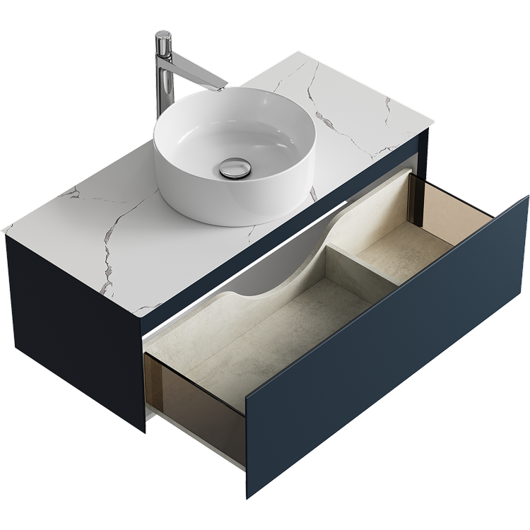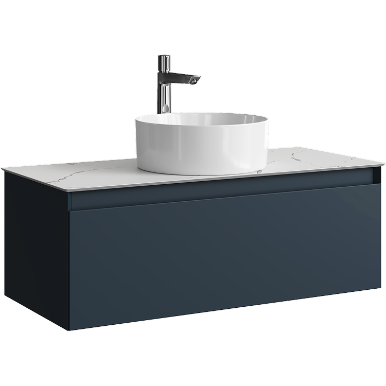 Подвесная тумба с одним ящиком 100 см, цвет серый со столешницей мрамор белый и накладным умывальником