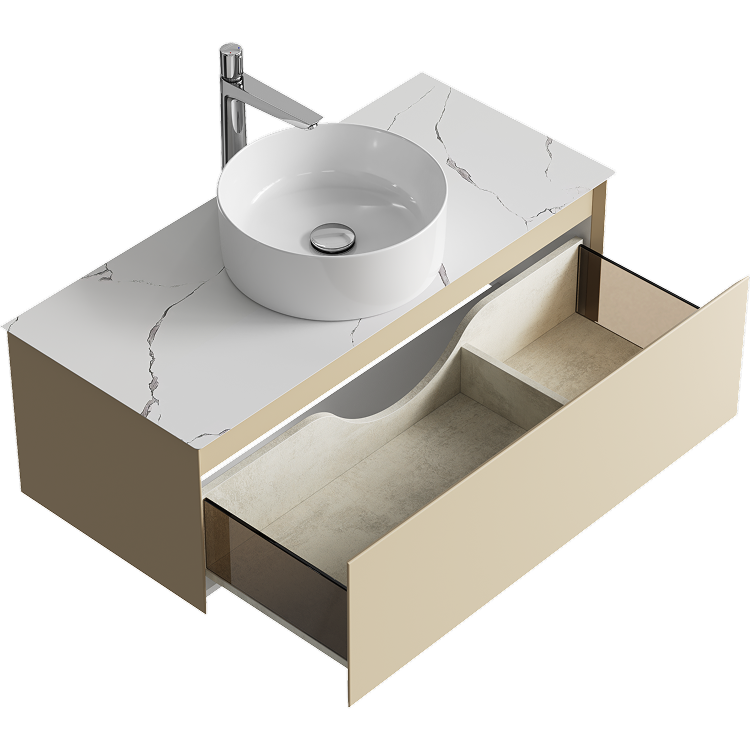 Подвесная тумба с одним ящиком 100 см, цвет морская дюна со столешницей мрамор белый и накладным умывальником