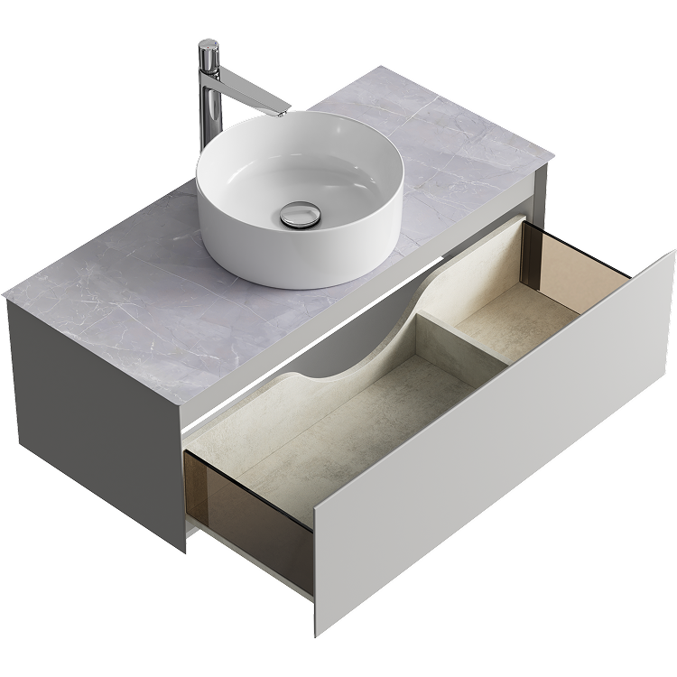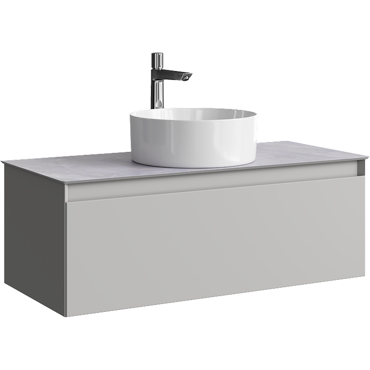 Подвесная тумба с одним ящиком 100 см, цвет серый туман со столешницей серый камень и накладным умывальником