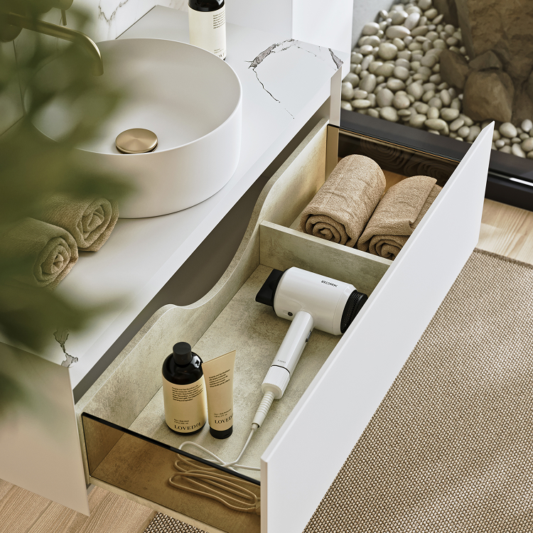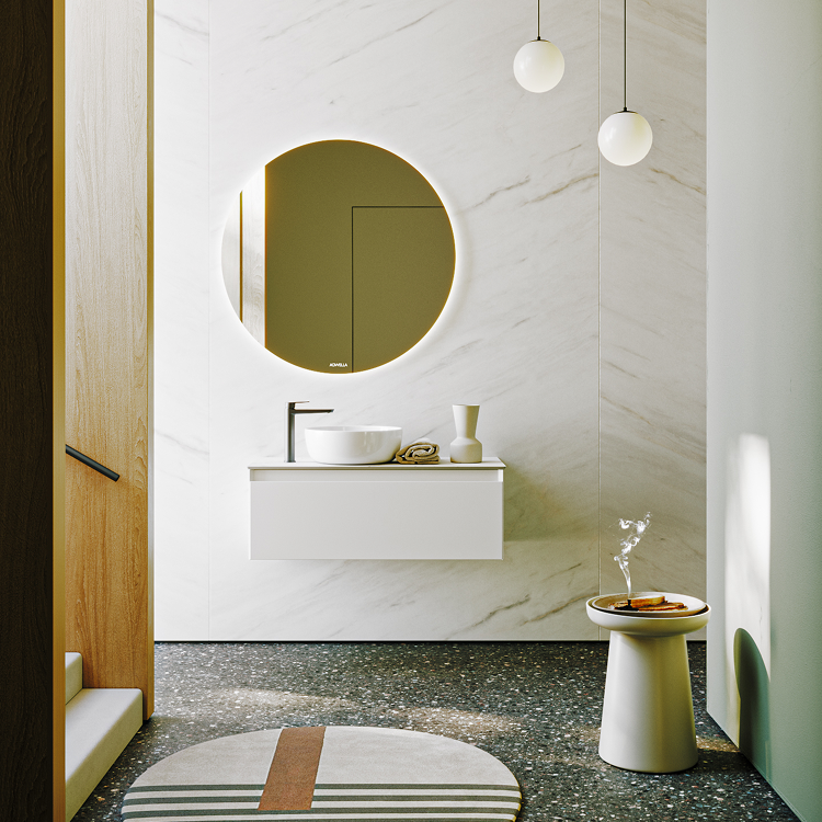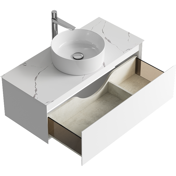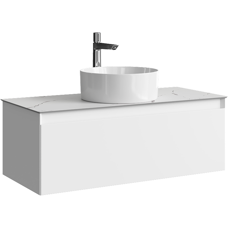 Подвесная тумба с одним ящиком 100 см, цвет белый со столешницей мрамор белый и накладным умывальником