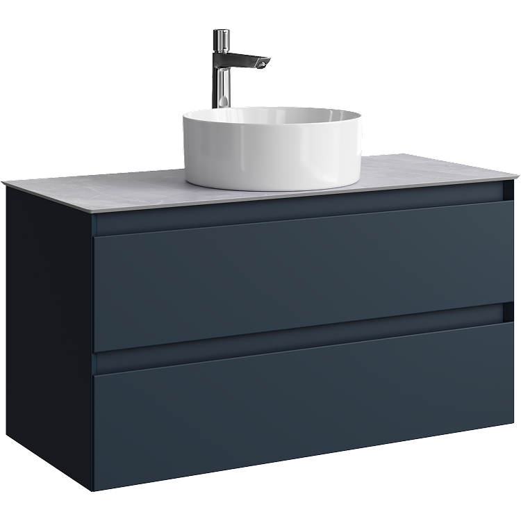 Подвесная тумба с двумя ящиком 100 см, цвет серый со столешницей серый камень и накладным умывальником