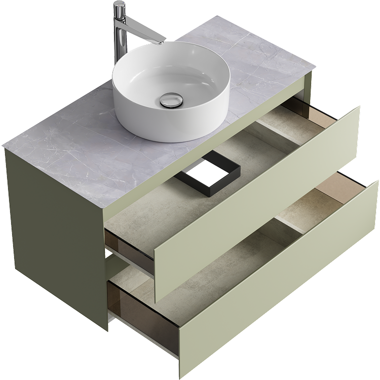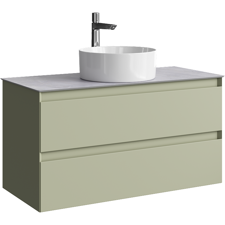 Подвесная тумба с двумя ящиком 100 см, цвет зеленый шалфей со столешницей серый камень и накладным умывальником