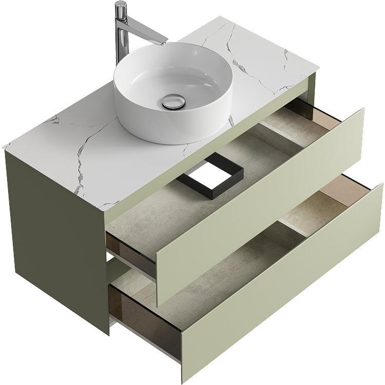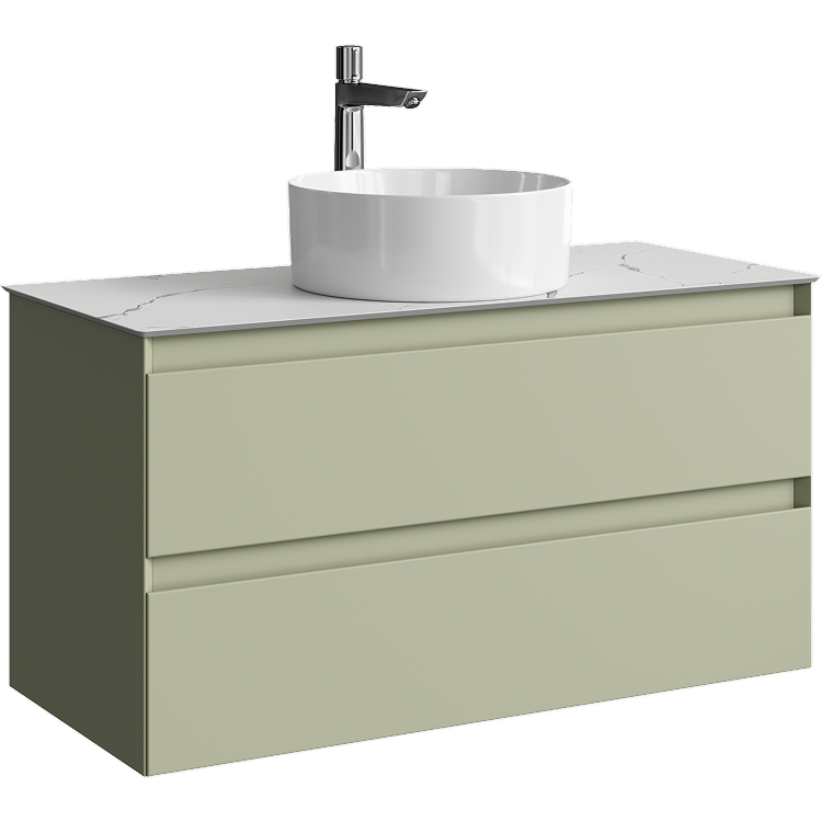 Подвесная тумба с двумя ящиком 100 см, цвет зеленый шалфей со столешницей мрамор белый и накладным умывальником