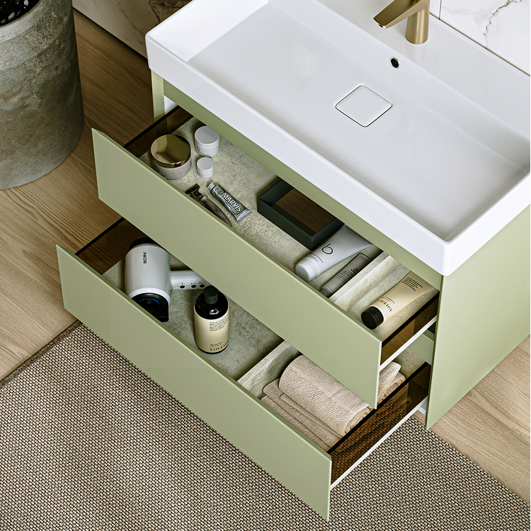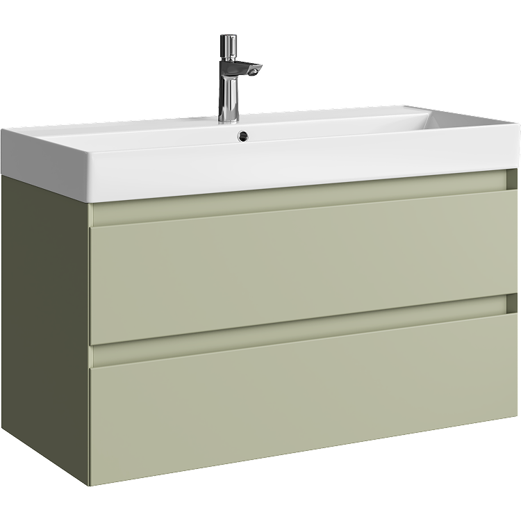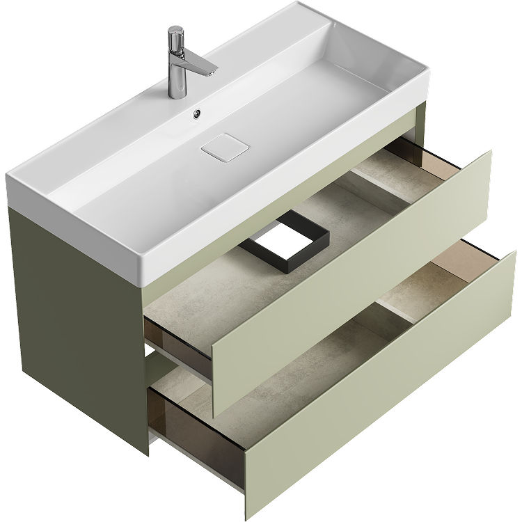 Подвесная тумба с двумя ящиками 100 см, цвет зеленый шалфей с умывальником
