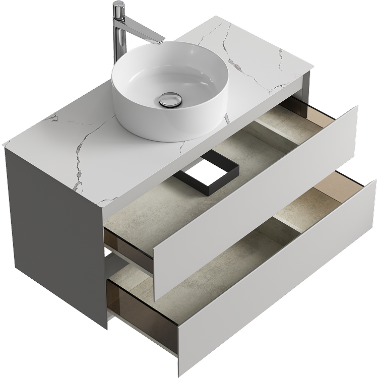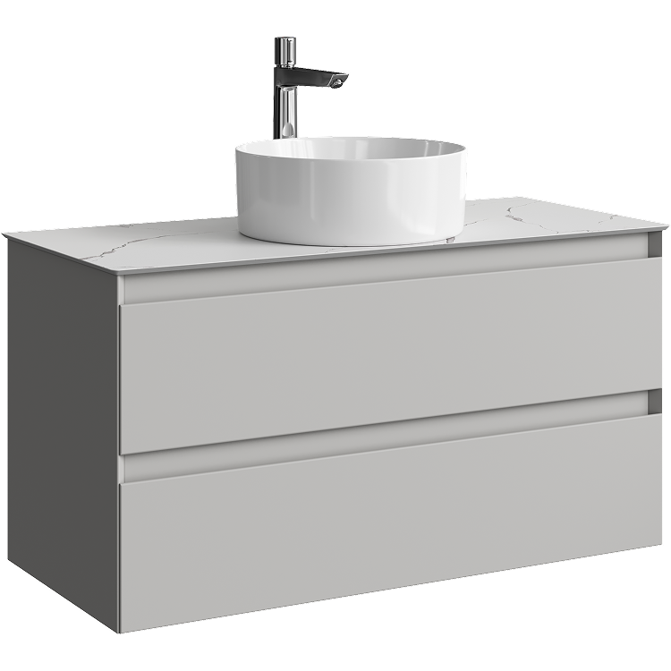 Подвесная тумба с двумя ящиком 100 см, цвет серый туман со столешницей мрамор белый и накладным умывальником