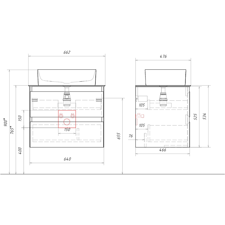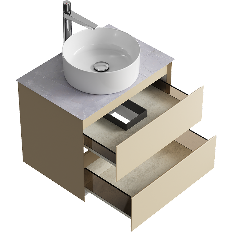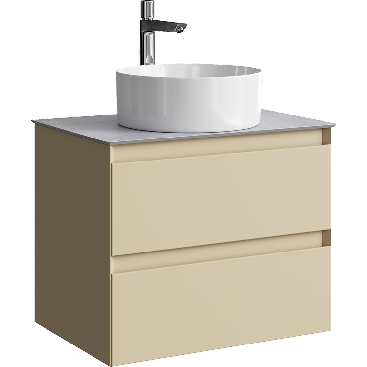 Подвесная тумба с двумя ящиками 65 см, цвет морская дюна со столешницей серый камень и накладным умывальником