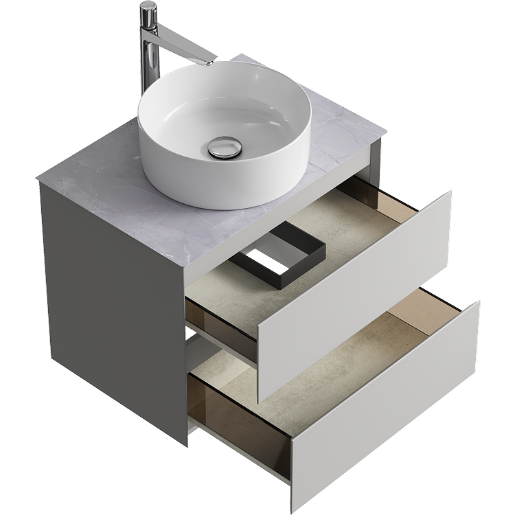 Подвесная тумба с двумя ящиками 65 см, цвет серый туман со столешницей серый камень и накладным умывальником