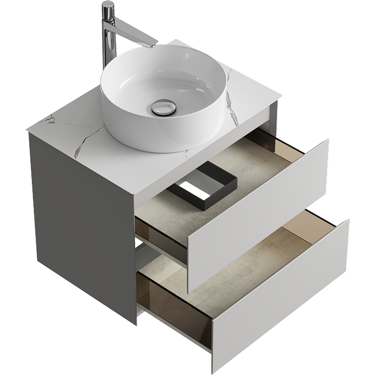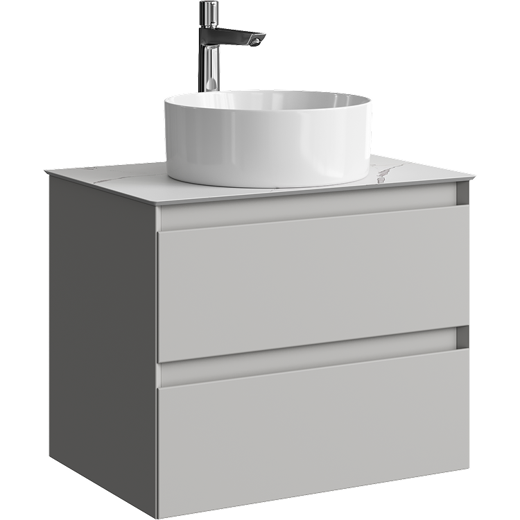 Подвесная тумба с двумя ящиками 65 см, цвет серый туман со столешницей мрамор белый и накладным умывальником