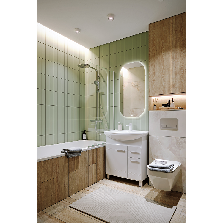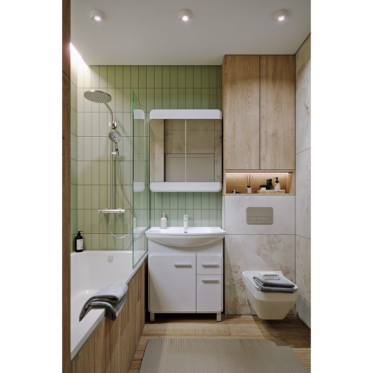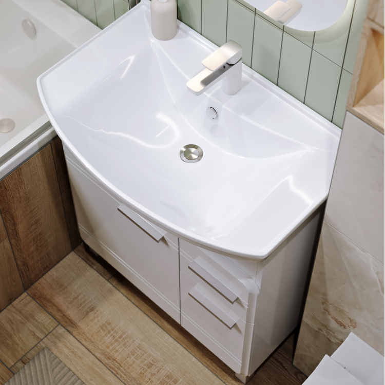 Коллекция представлена напольными тумбами в трёх размерах: 65, 75, и 85 см по ширине и комплектуется керамическими умывальниками производства российского завода Kirovit.