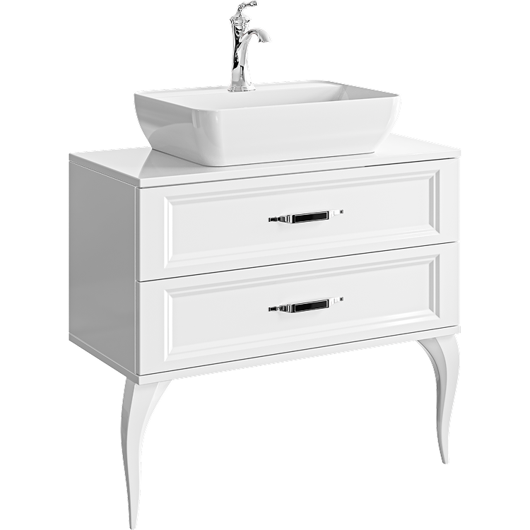 Напольная тумба с двумя ящиками в белом глянцевом цвете с умывальником из литьевого мрамора