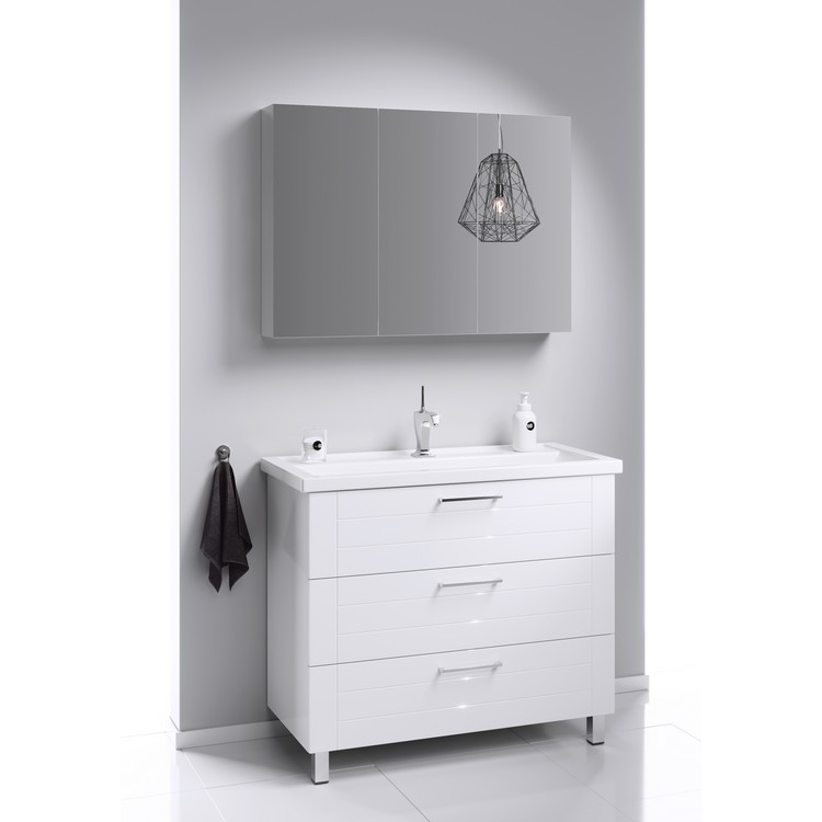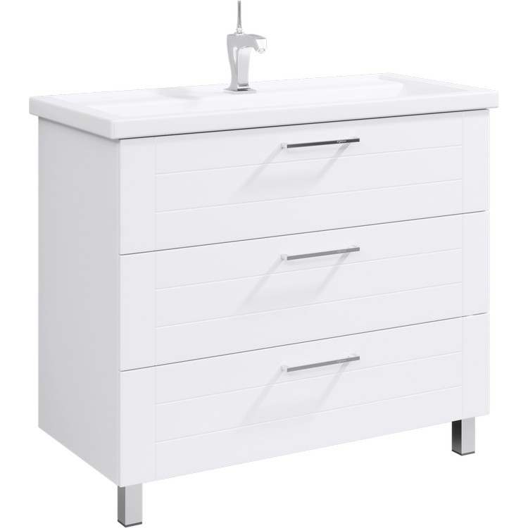 Напольная тумба в белом глянцевом цвете с тремя ящиками с умывальником