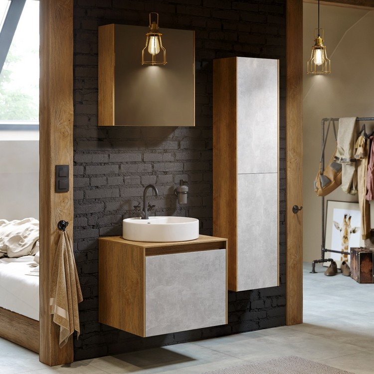 Коллекция Mobi гармонично вписывается в интерьер любой современной ванной комнаты. Так как существует возможность комбинировать фасады и корпуса трех цветов: бетон светлый, дуб балтийский и белый глянец.