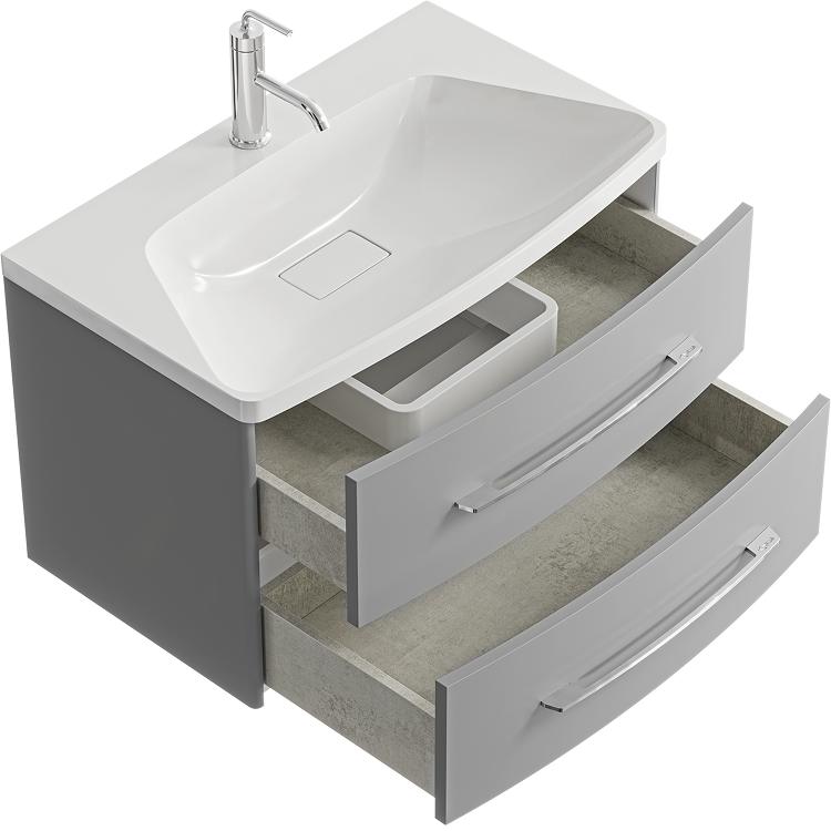 Подвесная тумба в цвете серый туман с двумя ящиками с умывальником из литьевого мрамора