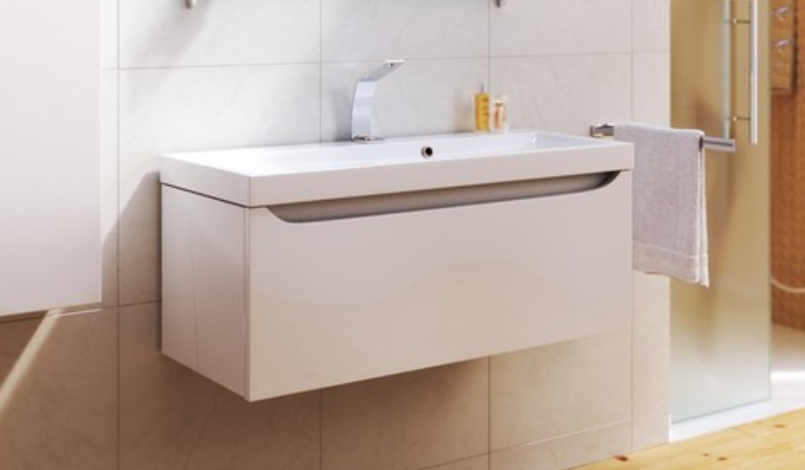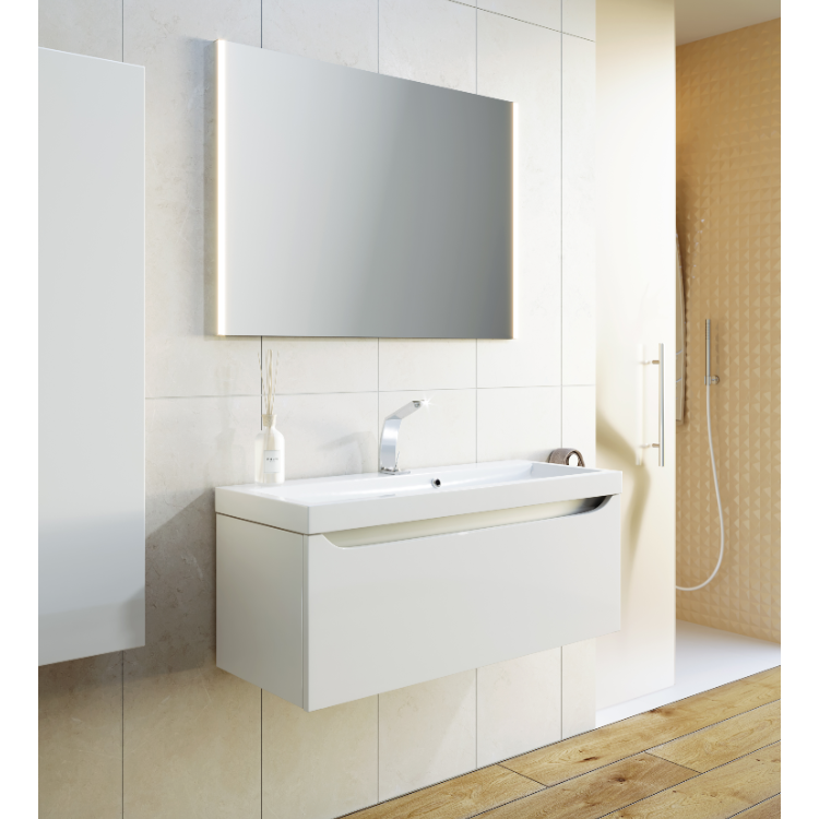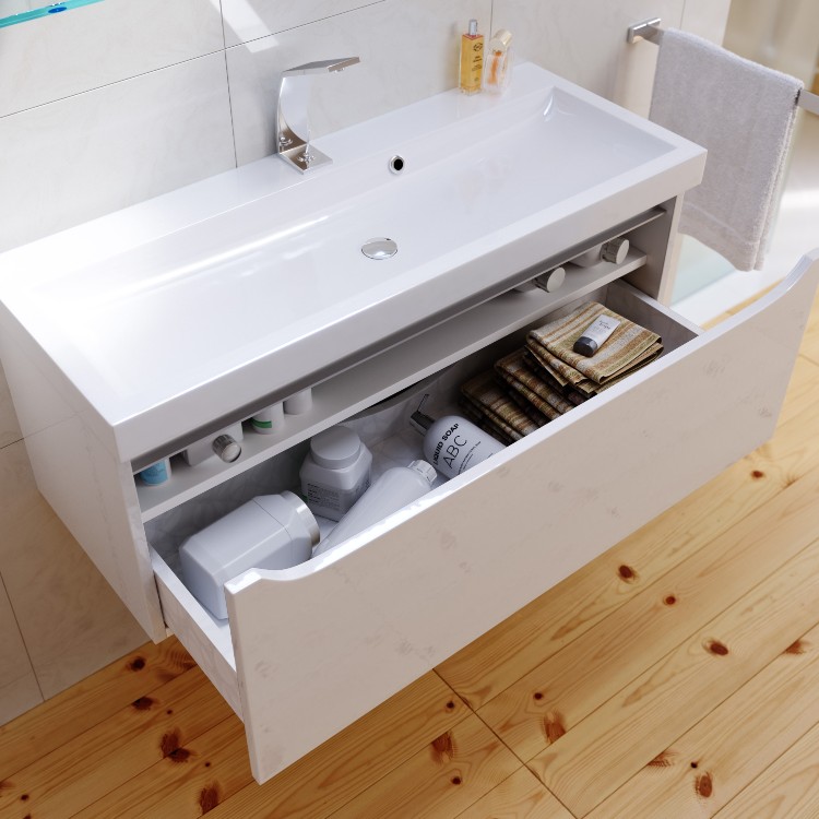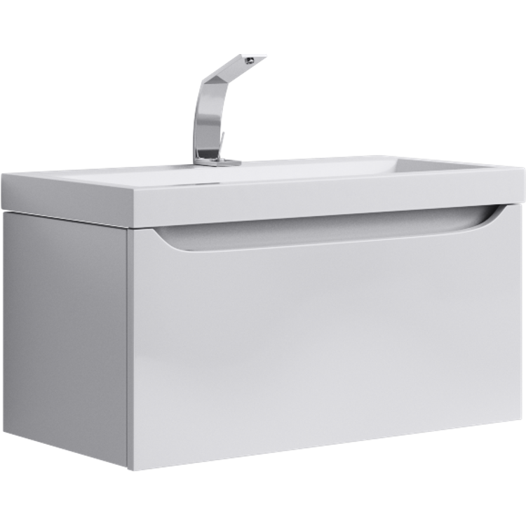 Подвесная тумба в цвете белый глянец с одним выдвижным ящиком и полкой, скрытой за фасадом, с умывальником из литьевого мрамора